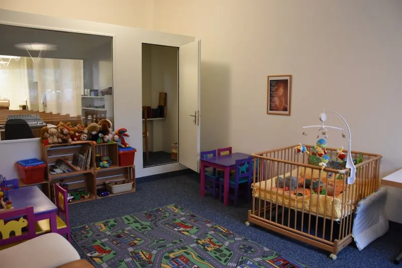 Für Babies and Kleinkinder, die zu jung sind für die Sonntagsschule, steht unser Kinderzimmer zur Verfügung. Für die Eltern hat es Stühle, Lautsprecher und ein Fenster in den Saal damit sie auch von hier aus den Gottesdienst und die Predigt verfolgen können.
